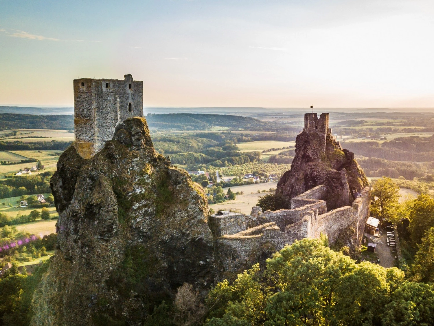 The original castle was built on two volcanic tops by Čeněk of Vartenberk in the 14th century. The castle ruins are a characteristic dominant feature of the region and one of the symbols of the Bohemian Paradise. The remains of two towers watch over the surrounding countryside. These are known as "the Old Hage" (Baba) and "the Virgin" (Panna). The beautiful viewpoints on both towers are open to the public.